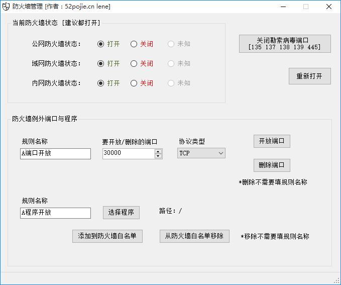 防火墙管理软件是一款简单轻小的计算机防火墙管理工具,软件采用极为简洁的界面以及一种便捷的方式帮助用户管理防火墙;不少用户在使用计算机时,虽然知道防火墙的作用,但是却不知道如何设置防火墙,还有部分用户不知道从哪儿打开防火墙,为了解决这类用户的困扰,今天小编为大家带来了这款简单易用的防火墙管理工具,通过这款工具,用户可以一键启动或者关闭计算机的内网,公网,以及局域网等,还可以一键关闭勒索病毒端口,直观的进行防火网开放端口设置,轻松就可以添加防火墙白名单,需要的朋友欢迎下载。